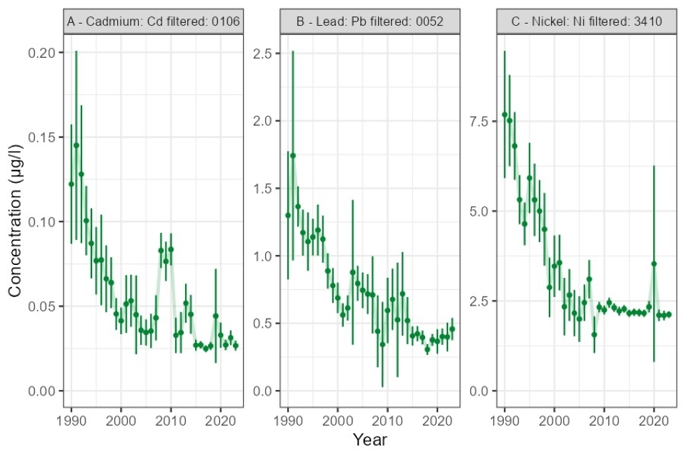 Figure 5. England HMS sites: trends in arithmetic mean concentration (dissolved, filtered, with 95% confidence interval) from 1990 to 2023 of A: cadmium, B: lead, C: nickel. See text for further information.