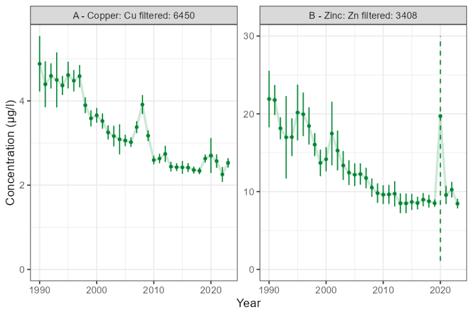 Figure 6. England HMS sites: trends in arithmetic mean concentration (dissolved, filtered, with 95% confidence interval) from 1990 to 2023 of A: copper, B: zinc. Dashed lines indicate truncated upper confidence interval (see Appendix A).