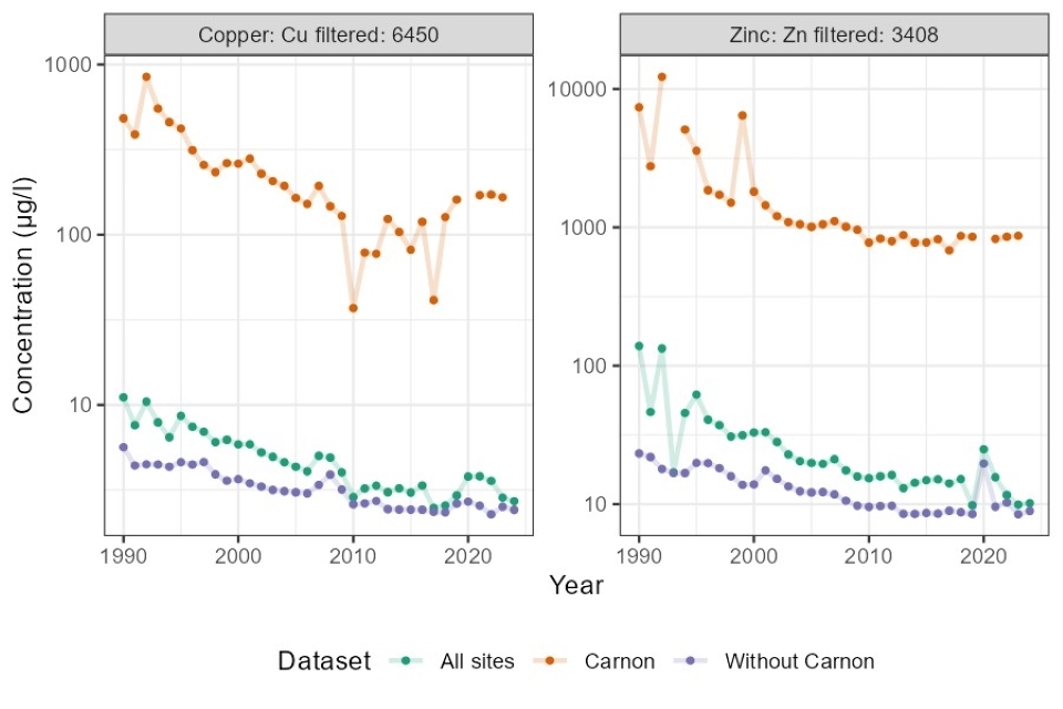 Figure 7. England HMS sites: Effect of inclusion (All sites) and exclusion (Without Carnon) of the River Carnon on the arithmetic means for copper and zinc from 1990 to 2023. Data for the Carnon itself also shown.