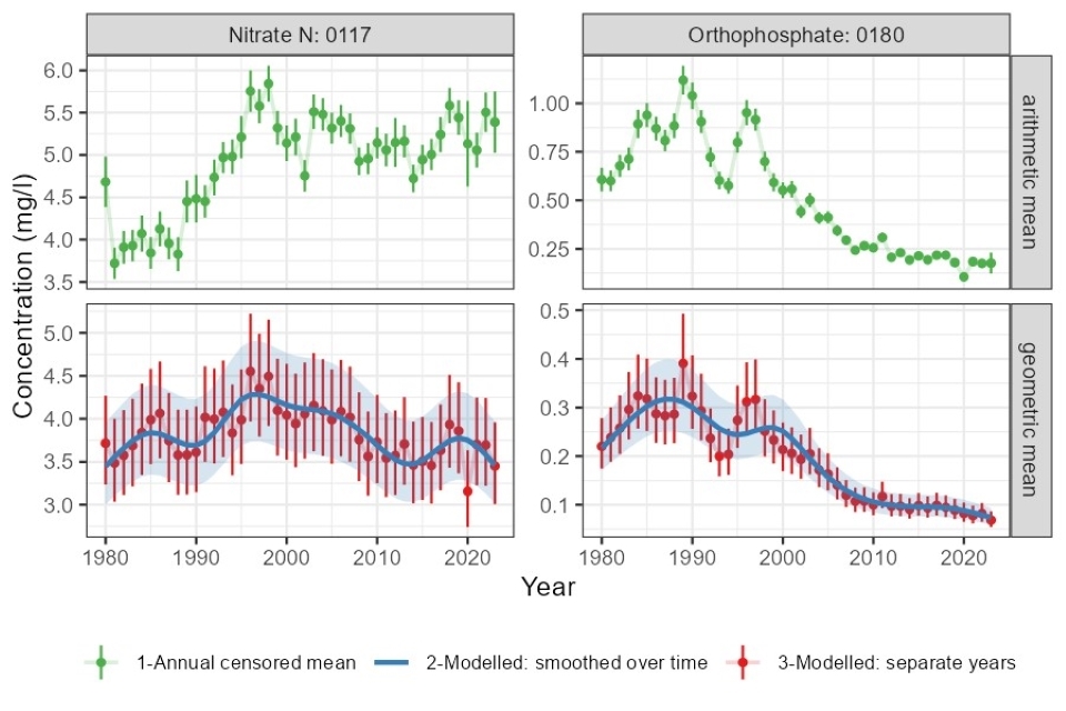 Trends for individual rivers will vary around these averages. Because of the logarithmic nature of concentration data, which may vary over 3 orders of magnitude, trends in arithmetic means may be dominated by the trends of the sites with the highest concentrations. The geometric mean will be less influenced by the sites and samples with the highest concentrations. Trends have also been derived for geometric mean concentrations using a statistical modelling approach. Relationships for orthophosphate and nitrate from annual means and a statistical modelling approach are compared in the Appendix C: overall conclusions are not dependent on the choice of analysis approach for this dataset.