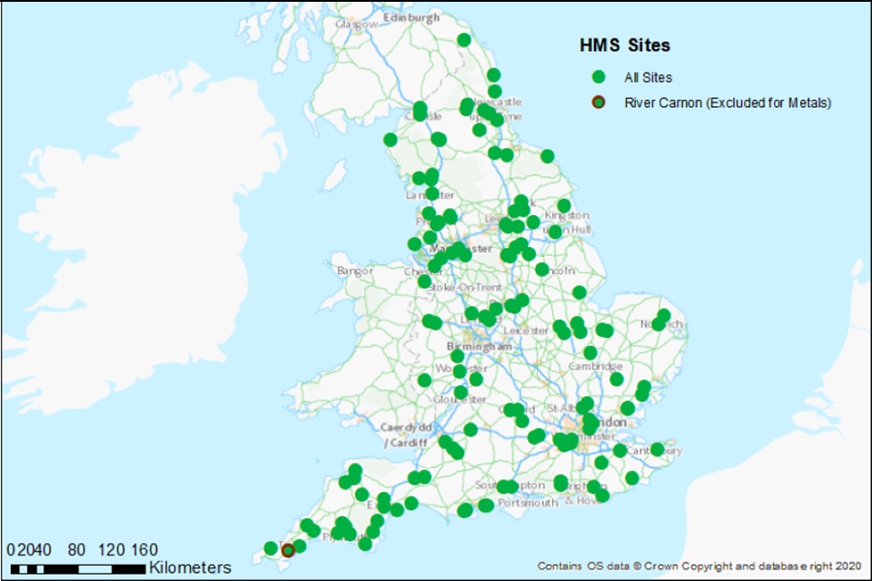 This map shows the location of the 135 HMS sites in England included in the analysis. One site on the River Carnon is highlighted as it was excluded in the calculation of concentrations for metals – the reason for this is covered later in this report.