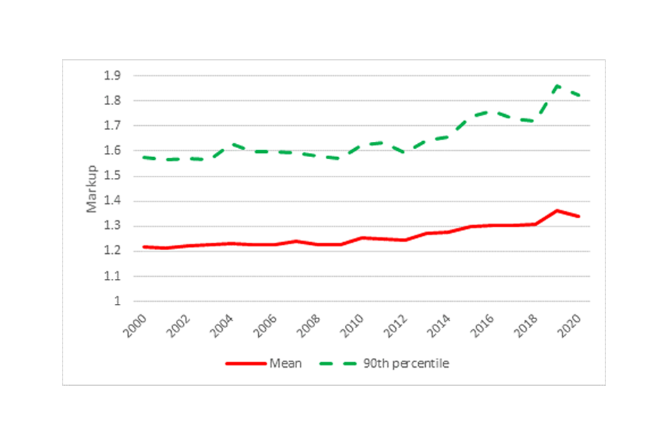 Image description: A line graph showing the mean (red line) markup of price over marginal cost and the equivalent graph for firms in the 90th percentile (dotted green line) between 2000 to 2020.