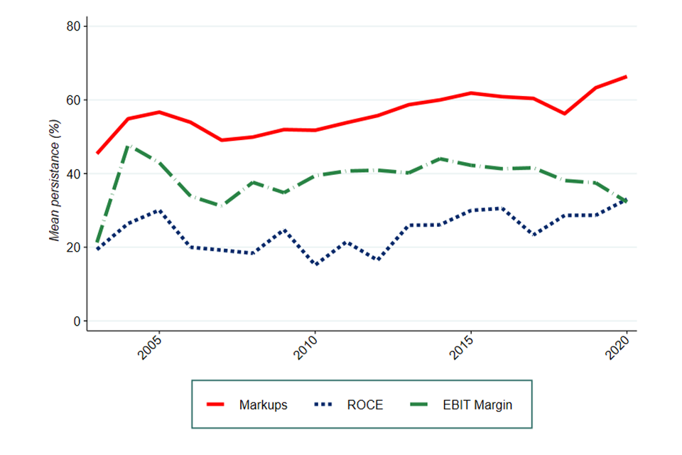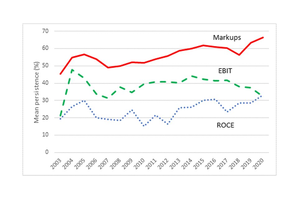 We have also looked at profit persistence. This shows the proportion of the top 10 most profitable firms in each industry which were also in the top 10 3 years ago. This provides a more mixed picture than the rank persistence measure, as shown in Figure 4. Profit persistence has increased as measured by markups over marginal costs and the Return on Capital Employed (ROCE), but has fallen back to pre-2008 levels for Earnings Before Interest and Taxes (EBIT).