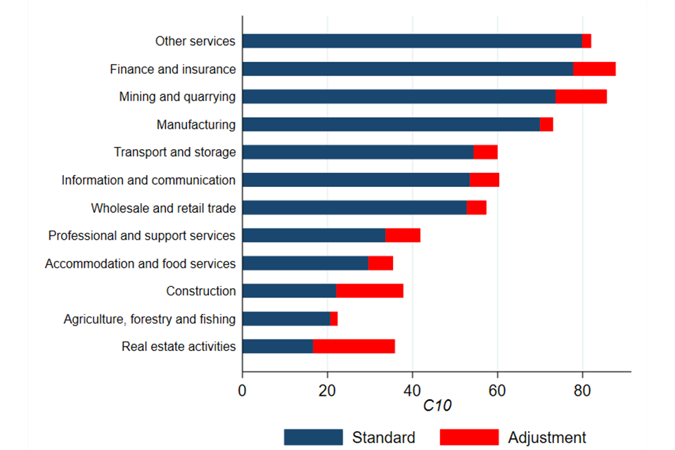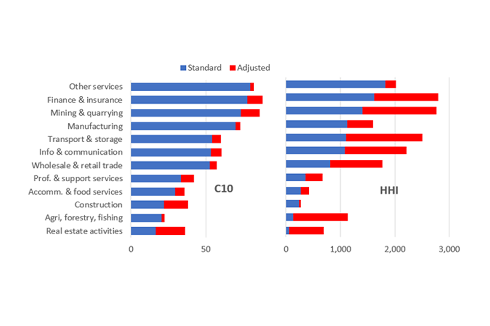 However, common ownership is more prevalent among larger businesses and in certain sectors: for example, in mining and quarrying, almost 30% of businesses are part of a common ownership group. Because of this, accounting for common ownership materially increases measured concentration in some sectors. Figure 5 shows this using 2 different measures of concentration. One is the combined market share of the 10 largest firms in each industry (C10); the other is the Herfindahl-Hirschman Index (HHI). [footnote 14] This chart shows that common ownership can have a significant effect on the HHI.
