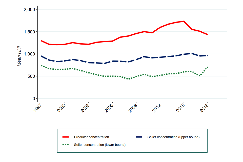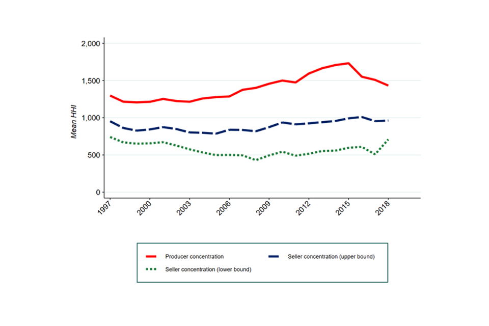 Image description: 3 line graphs illustrating various measures of concentration between 1998 to 2019. The red line represents traditional measures of concentration, “producer concentration”. The dashed blue line and dotted green line represent concentration when measured from the seller’s perspective and illustrate upper and lower bound measures respectively.