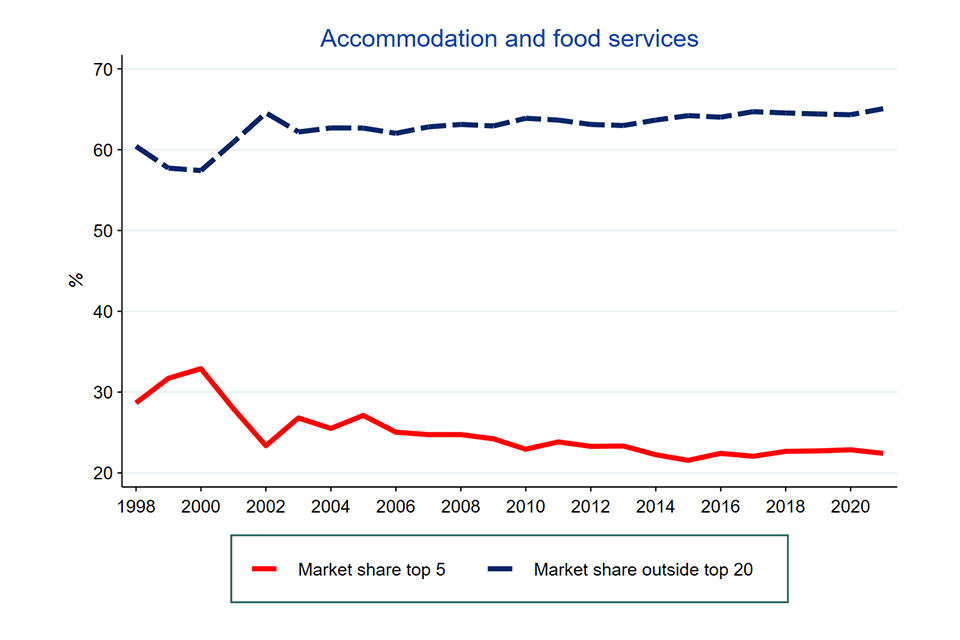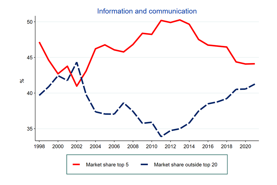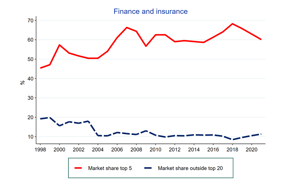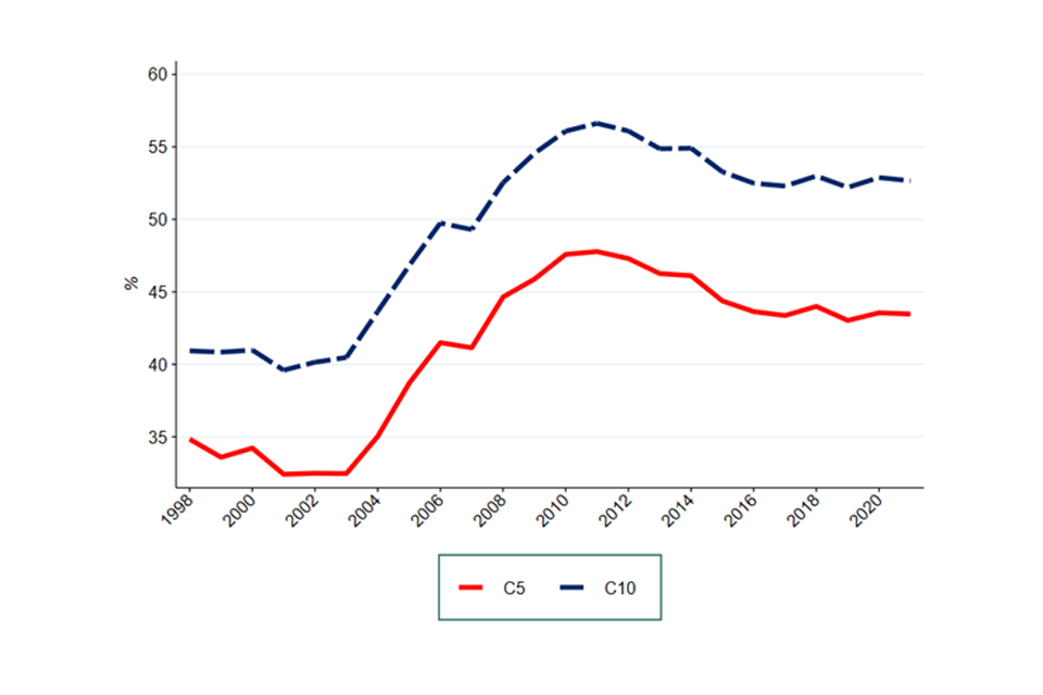 Image description: A line graph showing the average market share of the largest 5 firms in each industry between 1998 to 2021.