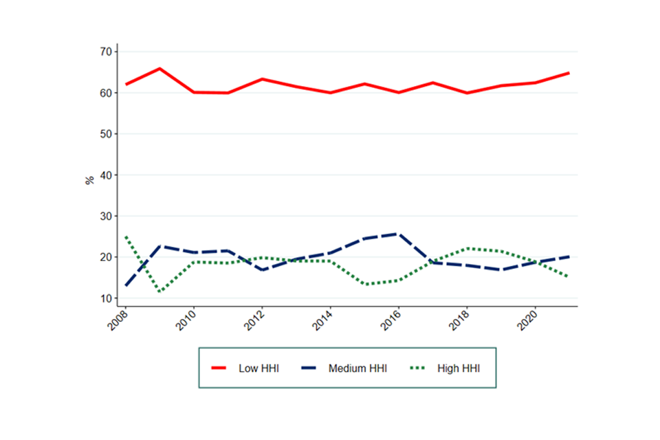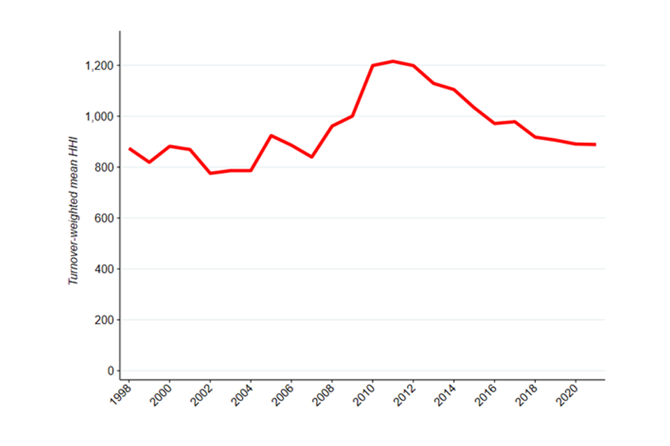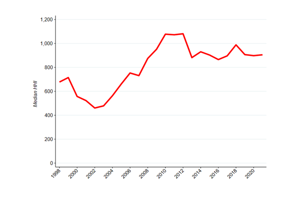 Image description: A line graph showing the median HHI across the UK economy from 1998 to 2021.