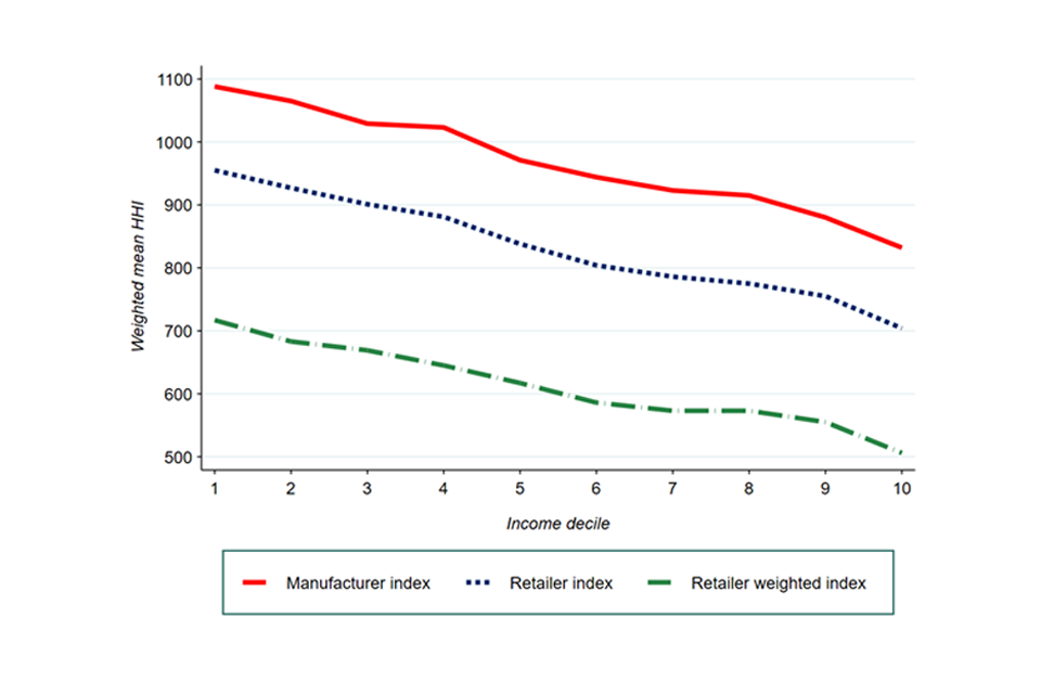 In the concentration, industry structure, and distributional impacts section, it considers another aspect of the consumer experience: the extent to which those on low incomes are more likely to buy in markets in which there are fewer supplier and less choice. Overall, we find that households on lower incomes are significantly more likely to consume goods and services produced in more concentrated industries. This is because markets for essential goods and services (which, for those on low incomes, account for a higher proportion of expenditure) tend to be more concentrated. This is illustrated in Figure 7. It shows that whilst the average concentration faced by the 10% least well off consumers is about 1,100, this drops to less than 900 for the 10% most well off consumers.