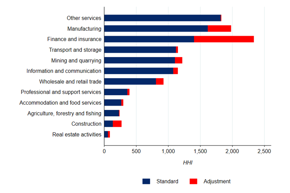 Adjusted concentration also considers how concentration is affected when international trade is accounted for. The standard data that is used for measuring concentration in the UK excludes imports into the UK and exports out of the UK. We have attempted to correct for this using the available trade data. This analysis, which relates to a sample of manufacturing industries only, is illustrated in Figure 6. The red line shows our standard measure of overall concentration, whilst the blue and green lines show the upper and lower bounds of our estimates of concentration once we take trade into account. The chart shows that overall concentration is lower when we account for international trade. This highlights the important role that international trade plays in contributing to keeping UK markets competitive. Whilst the effect seems significant at the aggregate level, it should be noted that the result will vary across specific industries. For instance, in industries where large volumes of imports come from a small number of overseas suppliers, accounting for international trade will tend to increase measured concentration.