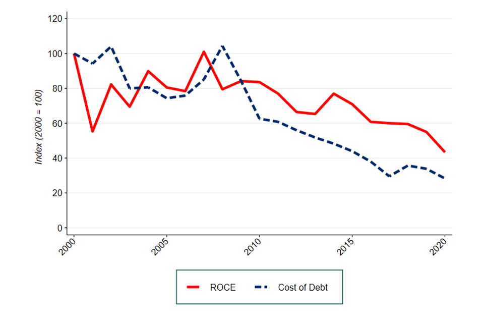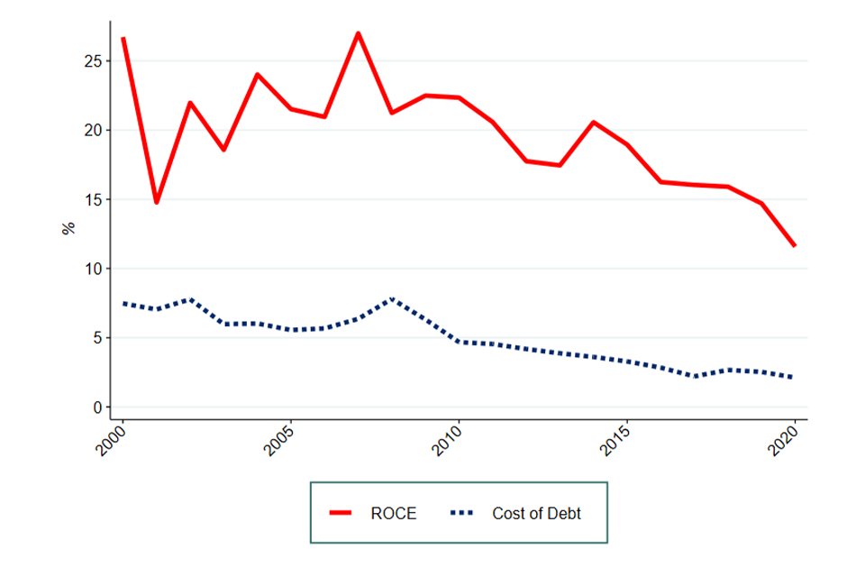 While the BBB 5-7 Index is based on the cost of debt faced by a small portion of all UK companies, as seen in Figure C.3 in Appendix C, all of the different proxies for the cost of debt consider follow very similar trends from 2000 to 2020. Therefore, regardless of the proxy chosen for cost of debt we would still expect to see similar trends in ROCE. ↩