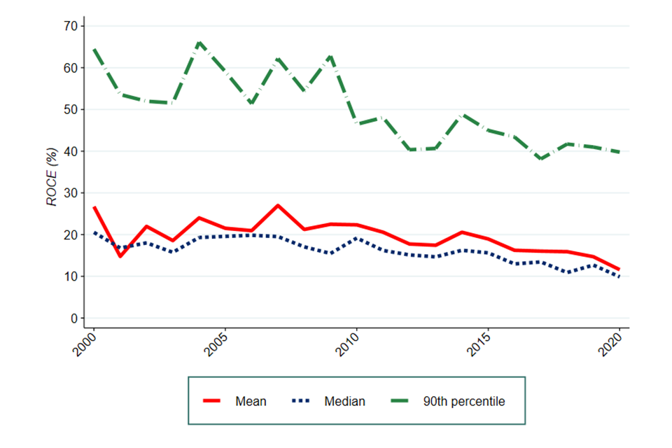 Following De Loecker, Eeckhout and Unger (2020), we order firms by ROCE and then compute the percentiles based on turnover. We do this to be consistent with the turnover-weighted mean ROCE. ↩