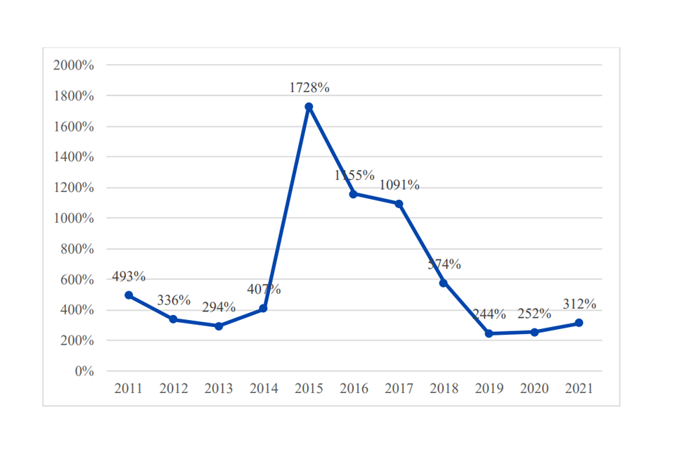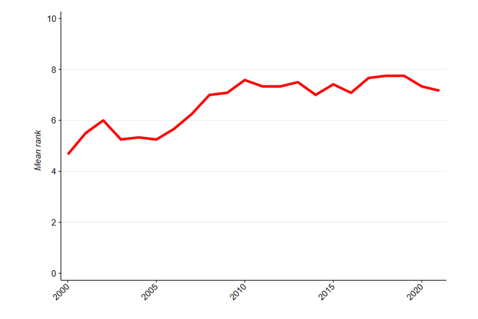 “Dynamic” indicators of competition include rates of firm entry and exit, and the extent to which high-performing firms sustain or get dislodged from their position. These measures help us assess the extent of change and churn in an industry over time. In an open competitive market we expect to see firms entering and leaving markets, and jostling for market share, as this is an important part of the competitive process. Looking at these measures, there is evidence that the largest and most profitable firms are able to sustain their strong position for longer than they used to. Figure 3 shows the rank persistence of the top 10 firms in each industry over time. The rank persistence measures how many of the top 10 firms in an industry were also in the top 10 3 years ago. Figure 3 shows that over the last 20 years, the likelihood of the largest firms in an industry remaining the largest firms has increased. The chart shows that whilst the rank persistence was around 5 before 2008, it has been between 7 and 8 since.