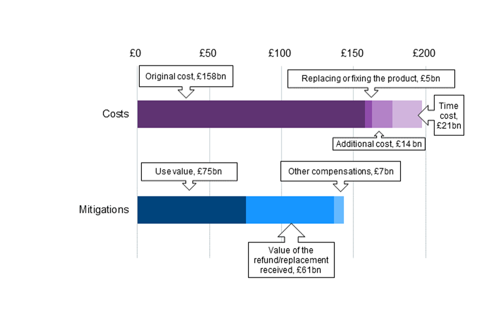 For ‘Time cost’, each hour spent dealing with detriment was estimated to have a monetised value of £13.87. ‘Use value’ is the value that was retained by the product. It is a combination of assumed use value and self-reported subjective value, depending on the detriment type and those components which mitigate the overall cost faced when subtracted from the initial costs. For further detail on the methodology, see Appendix E of the CPS report, pp129 to 133. ↩