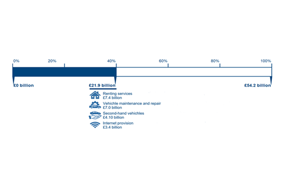 The study estimates that the total net value [footnote 18] of consumer detriment was £54.2bn, two-fifths of which comes from just 4 sectors: renting services, vehicle maintenance and repair, second-hand vehicles, and internet provision.