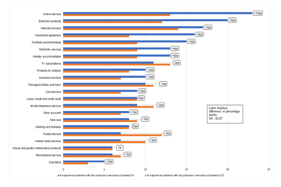 In the period covered by the CPS (the year to April 2021), most consumers (around 7 in 10) experienced some sort of “detriment” or “harm”. This is caused by a problem with something they had bought or used. Problems were more frequently encountered with services than with goods. In addition, the average cost to consumers of these problems is higher with services (£41) than with goods (£14).