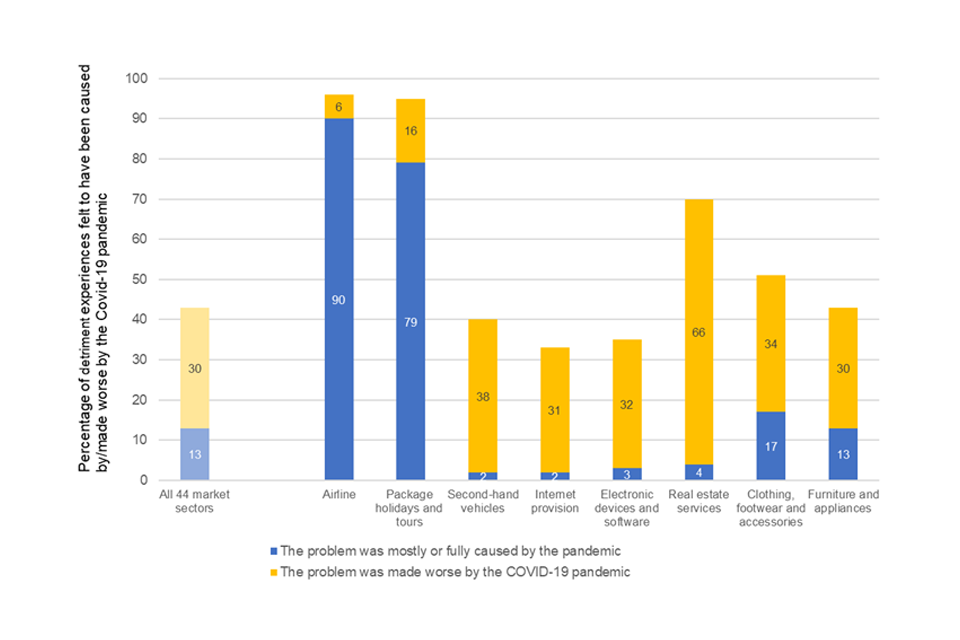 From the consumer perspective, the pandemic is likely to have affected the level and pattern of detriment in markets. The CMA received tens of thousands of complaints about difficulties consumers had experienced in obtaining refunds for travel and holidays that were cancelled because of lockdown restrictions.[footnote 24] This is borne out by evidence from the BEIS Consumer Protection Study 2022 (Consumer survey evidence), which found ‘airlines’ and ‘package holidays and tours’ to be the sectors in which consumers were most likely to have experienced detriment. In over 90% of cases, consumers reported that the problems they had experienced in these sectors had been caused or made worse by the pandemic.