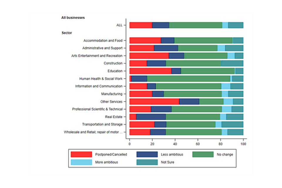 Evidence from surveys of business owners (discussed in business survey evidence) unsurprisingly indicates that the pandemic was a significant barrier to growth, with over a third of businesses with expansion plans saying that these were postponed, cancelled or scaled back as a result.[footnote 22] Businesses also report that innovation levels have been affected by the pandemic, with a fall in the proportion of businesses reporting either product or service innovation in 2020 compared to 2019 (though levels remained higher than in 2018).[footnote 23]