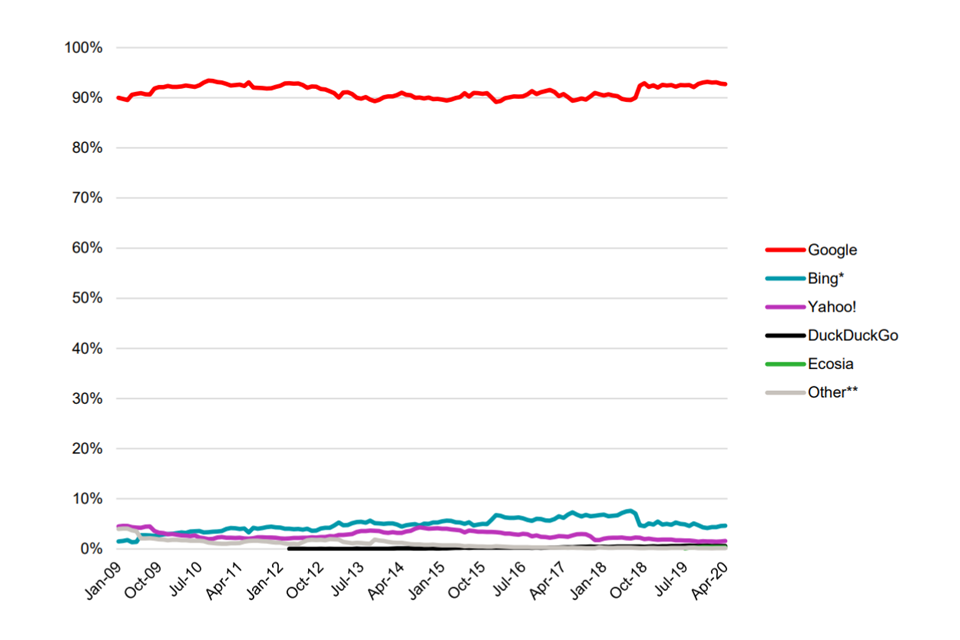 Weak competition in search and social media markets risks leading to reduced innovation and choice, as well as to consumers giving up more data than they would like. Google and Meta’s (Facebook’s)[footnote 25] strong position also means that businesses are more likely to pay more for digital advertising than they would in a more competitive market, a cost that we would expect ultimately be reflected in higher prices for consumers.