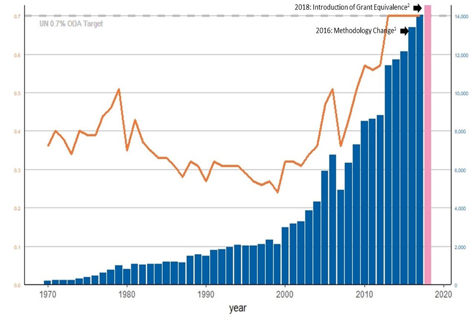 As announced in a previous edition of Statistics on International Development (SID), this publication presents ODA for 2018 on a grant equivalent basis - the new standard for reporting ODA spend figures. The grant equivalent methodology affects how the values of loans disbursed by departments and other contributors are scored as ODA, which is different from the previous cash flow methodology used to present ODA in 2017. More information on this change can be found in an explanatory note and in the OECD reporting directives for ODA.