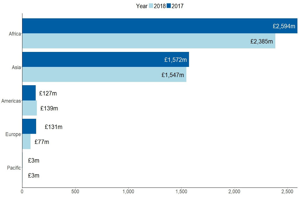 - Statistics on bilateral ODA by geographic region are currently only available for DFID spend. As a percentage of DFID’s bilateral country or region-specific spending, Africa received the largest share (57.5%) in 2018, representing £2,385 million. Africa’s share fell marginally compared with 2017, when Africa received £2,594 million (it was 58.6%)