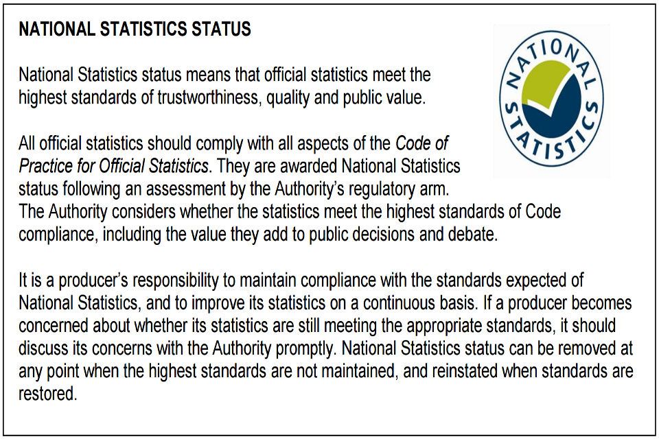 The Office for Statistics Regulation (part of the United Kingdom Statistics Authority) designated these statistics as National Statistics in March 2016, in accordance with the Statistics and Registration Service Act 2007 and signifying compliance with the Code of Practice for Statistics. Designation means the statistics carry the National Statistics label and conform to the standards summarised below.