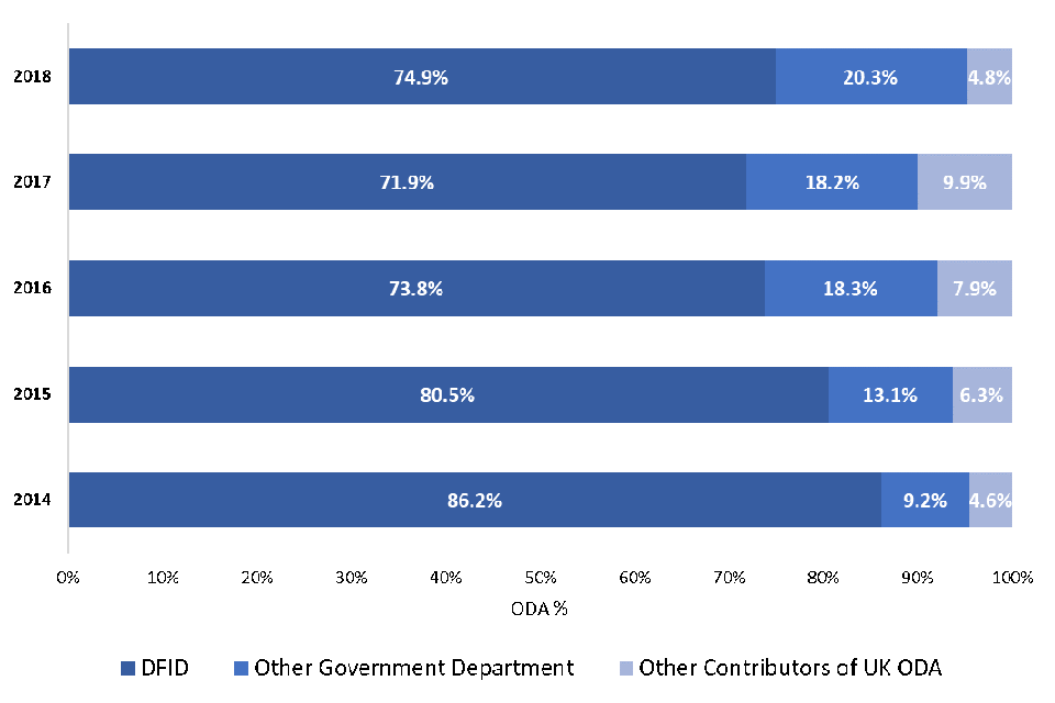 - The Department for International Development provided 74.9% of total UK ODA in 2018, up from 71.9% in 2017. The share of other UK ODA contributors (this includes other Government Departments and non-departmental contributors) was 25.1%, down from 28.1% in 2017