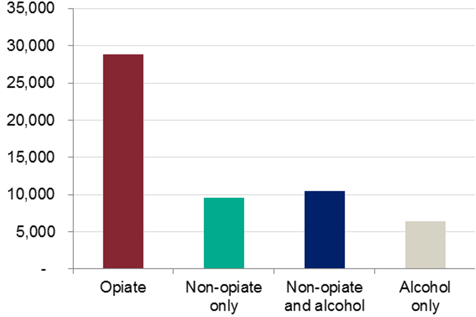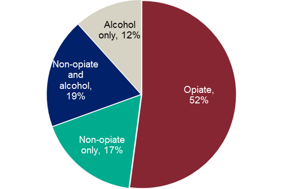 After opiates, alcohol was the next most common substance (25,828, or 47% of adults in treatment). The majority (63%, or 12,674) of people in the non-opiate group were in treatment for problematic cannabis use (68%, or 6,552, of non-opiate only; 58%, or 6,122, of non-opiate and alcohol clients).