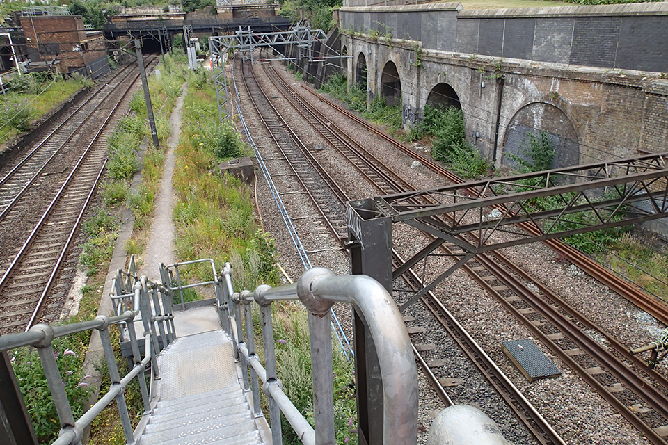 View from an overbridge of two sets of lines at South Hampstead from the access steps. Railway arches on on the right with two sets of overhead line gantries.