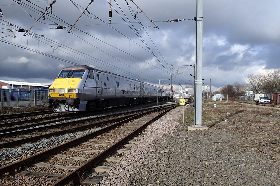A train passing an Overhead line stanchion at the site of the fatal accident at Newark.