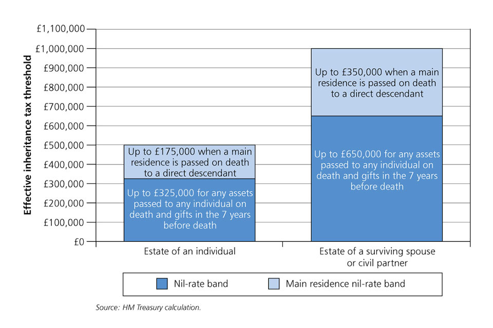 - takes the family home out of inheritance tax for all but the wealthiest with a new transferable nil-rate band of up to £175,000 per estate when a main residence is passed to direct descendants; this means that the effective inheritance tax threshold will be £1 million