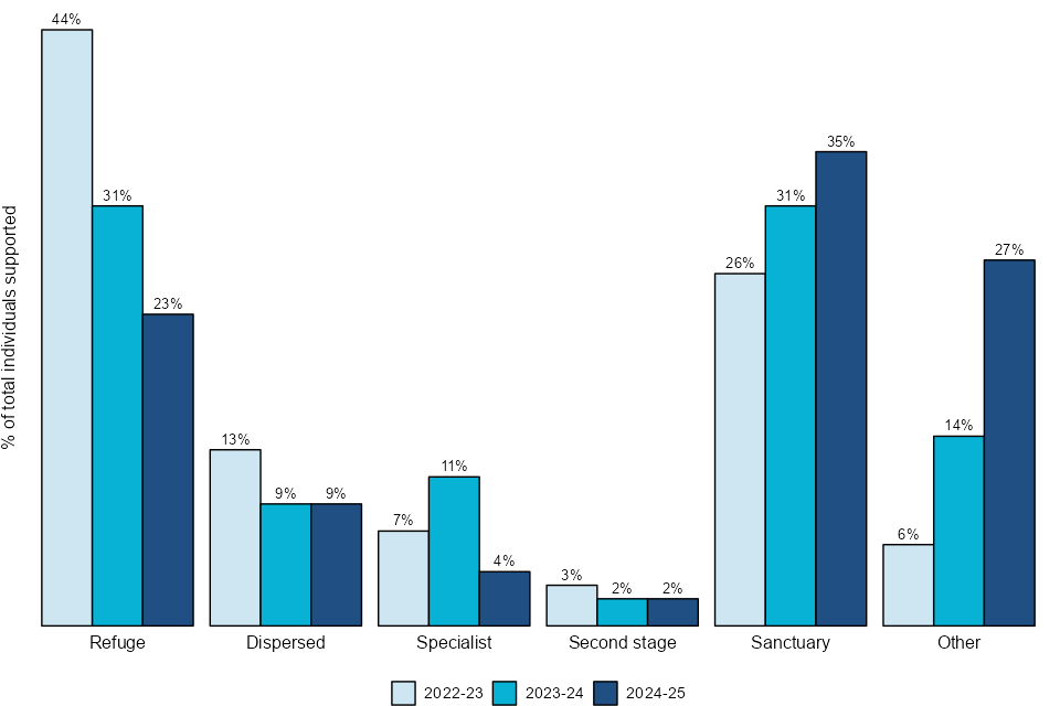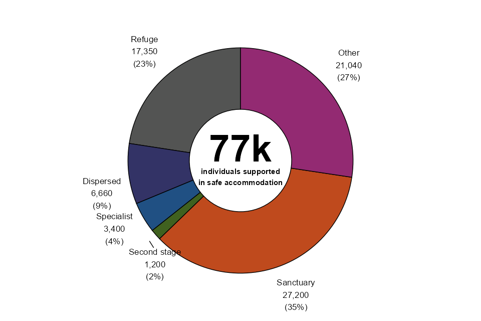 - The largest proportion of individuals were supported in sanctuary accommodation (35%), followed by other schemes (27%) and refuge accommodation (23%).