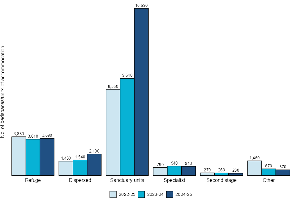 This year saw a significant expansion in provision, especially in sanctuary accommodation, which rose by 6,950 units (72%). However, some local authorities noted that sanctuary accommodation may have been underreported in previous years, suggesting the increase could be overstated- see Section 11.6 for more details.