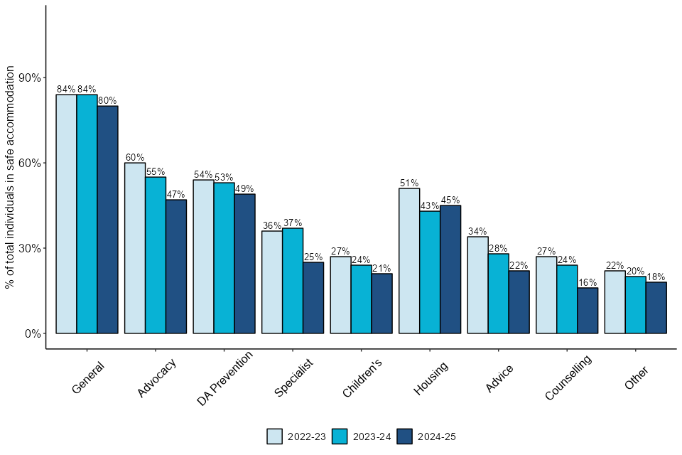In 2024–25, the most common types of support service received by individuals in safe accommodation were general support (61,230 or 80% of all individuals supported), advocacy (36,010 or 47%), and domestic abuse prevention advice (37,960 or 49%). However, note that victims may receive multiple types of support at various points during their stay, and the data does not capture the quality or duration of support provided.