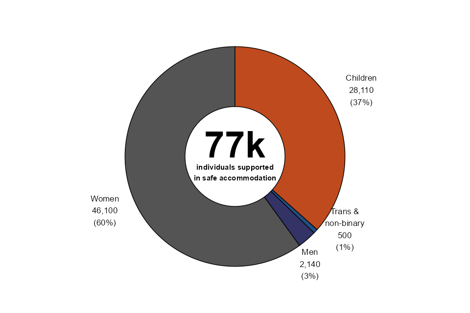 Of the total number of individuals supported in 2024–25, 46,100 (60%) were women, 2,140 (3%) were men, 500 (1%) were trans or non-binary adults, and 28,110 (37%) were children.[footnote 2]