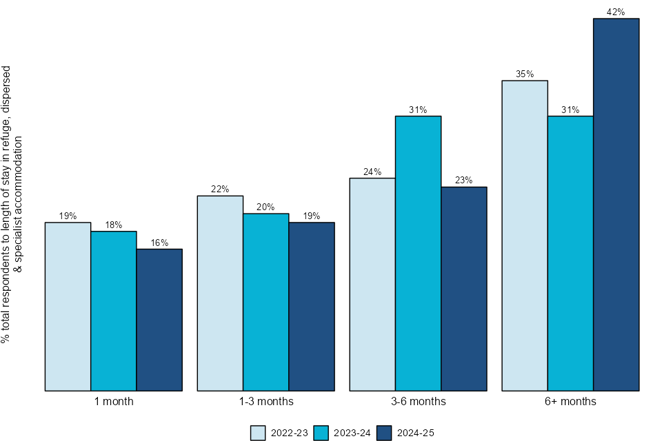 In 2024–25, the duration of support provided in refuge, dispersed, and specialist accommodation shifted toward longer-term stays. Of those who responded to questions about length of stay, 42% remained for six months or more—an increase from 31% in 2023–24 and 35% in 2022–23.