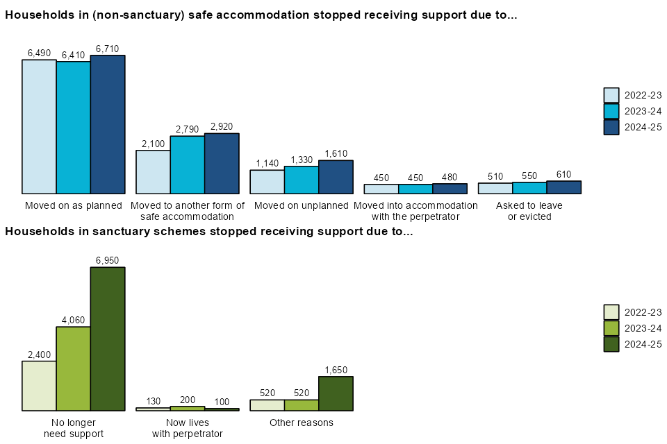 - 22,230 households stopped receiving support during the year, around 46% of those supported. For sanctuary schemes, the most common reason for ending support was that it was no longer needed, accounting for 80% of households that stopped receiving support in sanctuary accommodation. Among households moving on from non-sanctuary safe accommodation, the most frequently cited reasons were a planned move-on and a transition to another form of safe accommodation.