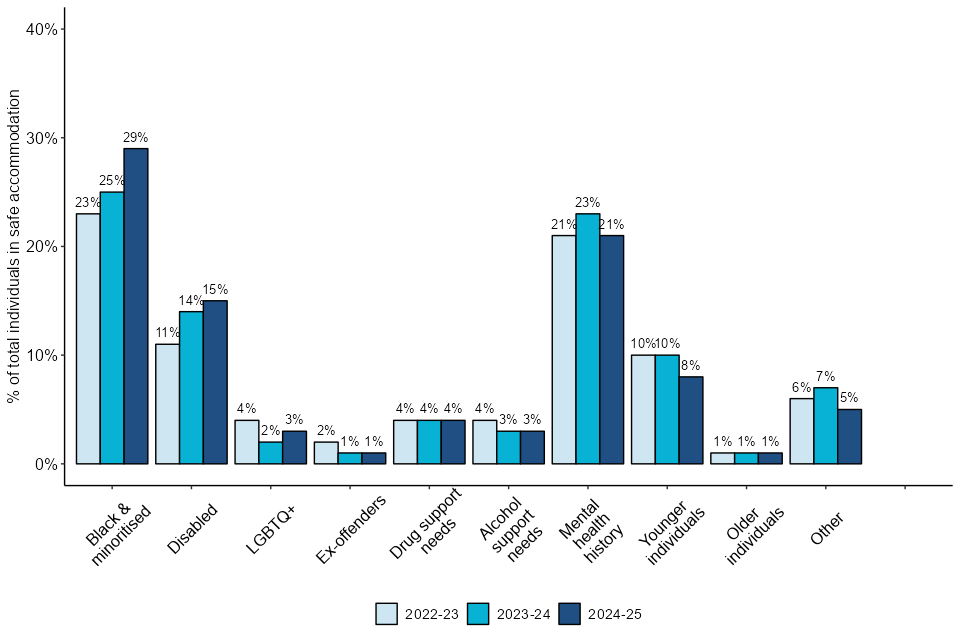 Figure 5: Proportion of individuals with specialist characteristic in safe accommodation between 2022-23 to 2024-25