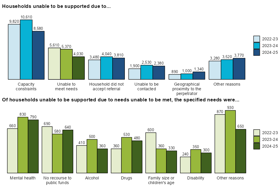 Between April 2024 and March 2025, local authorities reported that 28,190 households were referred to safe accommodation services but could not be supported. Although the overall number of unsupported households continues to rise, the pace of growth has slowed. The 5% increase in 2024–25 is a reduction compared to the 9% rise observed between 2022–23 and 2023–24.