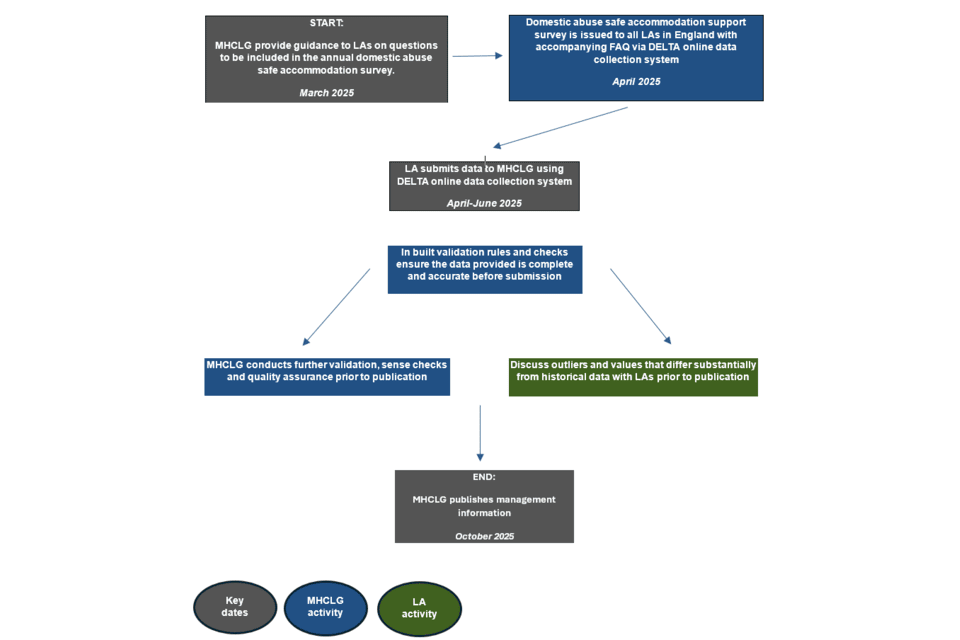 An outline of the production process and quality assurance carried out prior to the publication of the Support in Domestic Abuse Safe Accommodation management information is set out in the flowchart below.