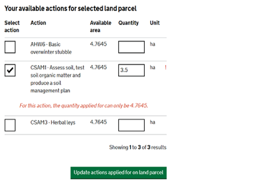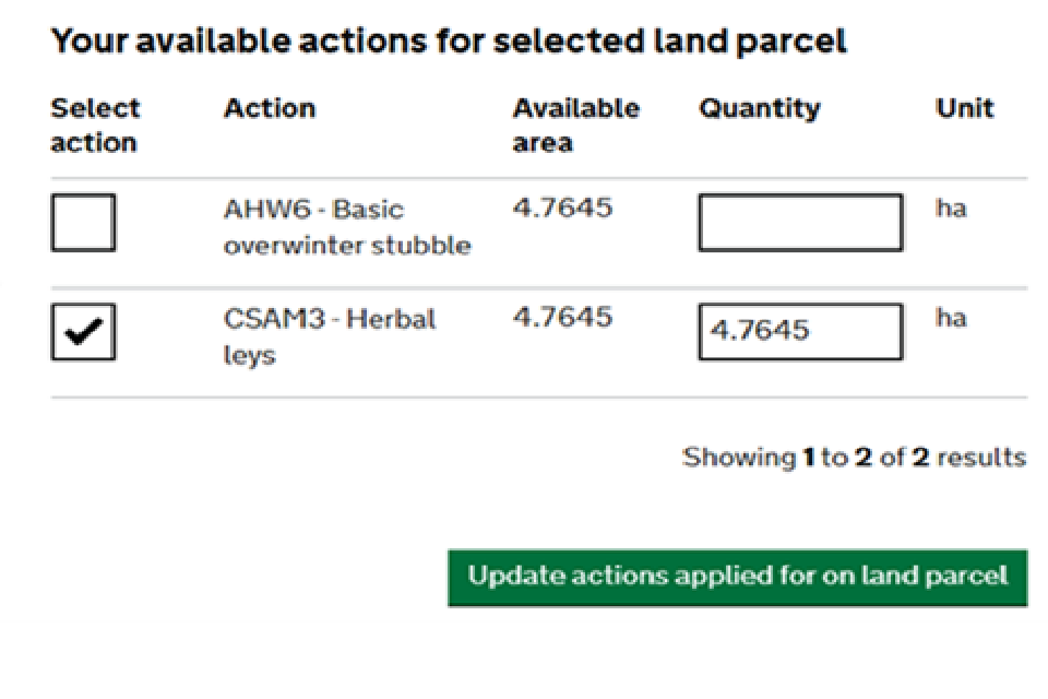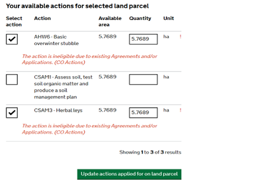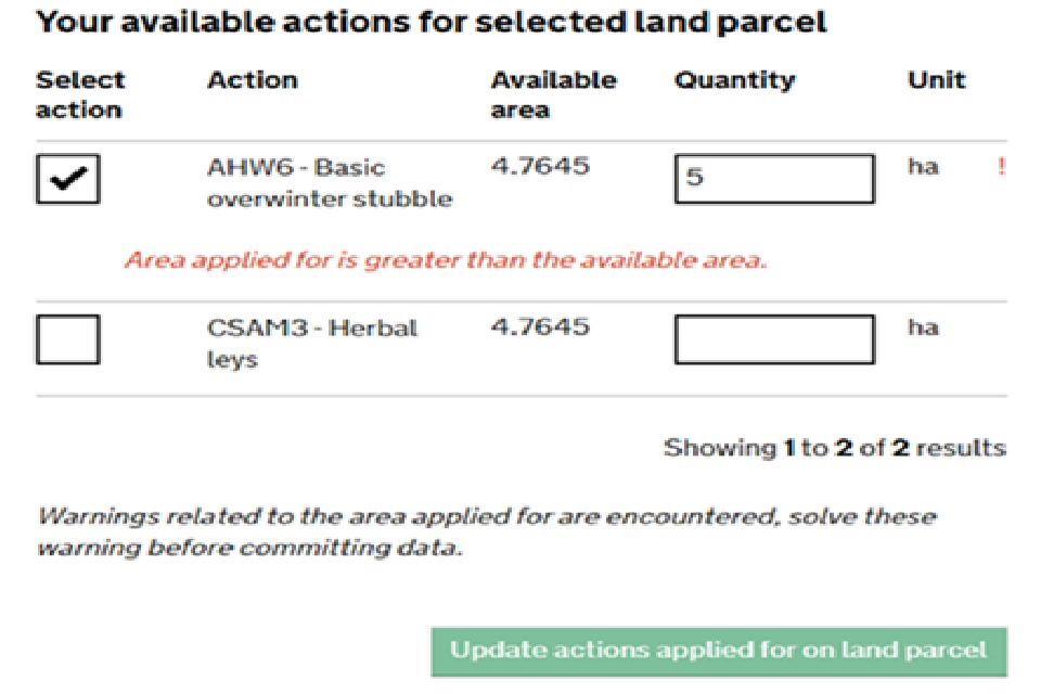 If you untick the ‘Select action’ box or delete an area from the ‘Quantity’ box, you may find that you cannot enter a new area. If this happens, click on ‘Update actions applied for on land parcel’ to reset the information.