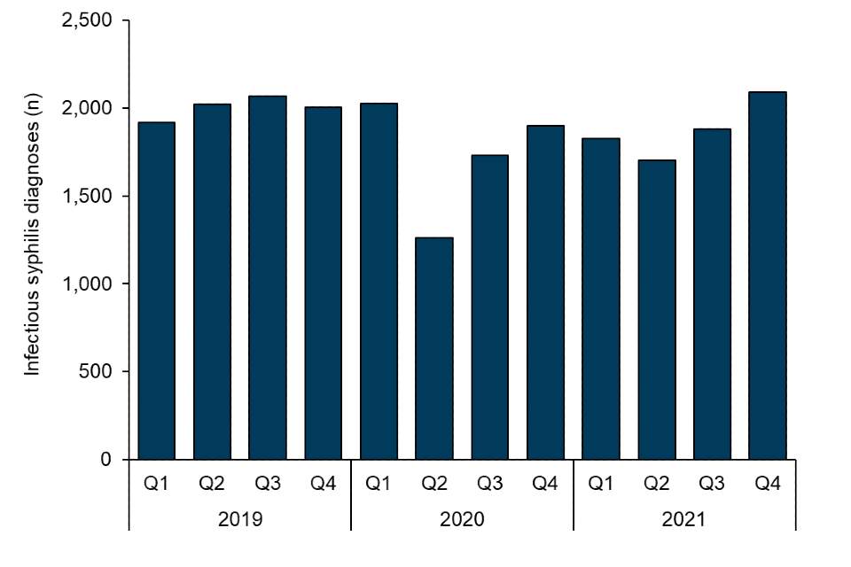 - by the end of 2021, diagnoses of infectious syphilis returned to pre-coronavirus (COVID-19) pandemic levels, that is, quarter 4 2021 (Q4 2021, 1 October to 31 December 2021) versus quarter 4 2019 (Q4 2019, 1 October to 31 December 2019)