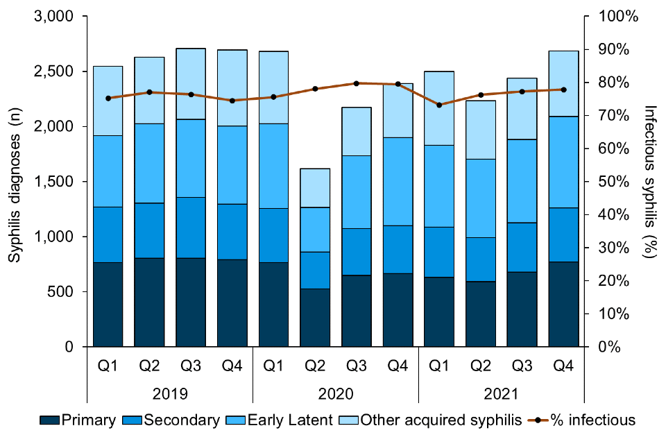 Whilst there was a reduction in the proportion of infectious syphilis from 80% to 73% between Q4 2020 and Q1 2021, the proportion of infectious syphilis has returned to pre-COVID-19 pandemic levels at 78% in Q4 2021.