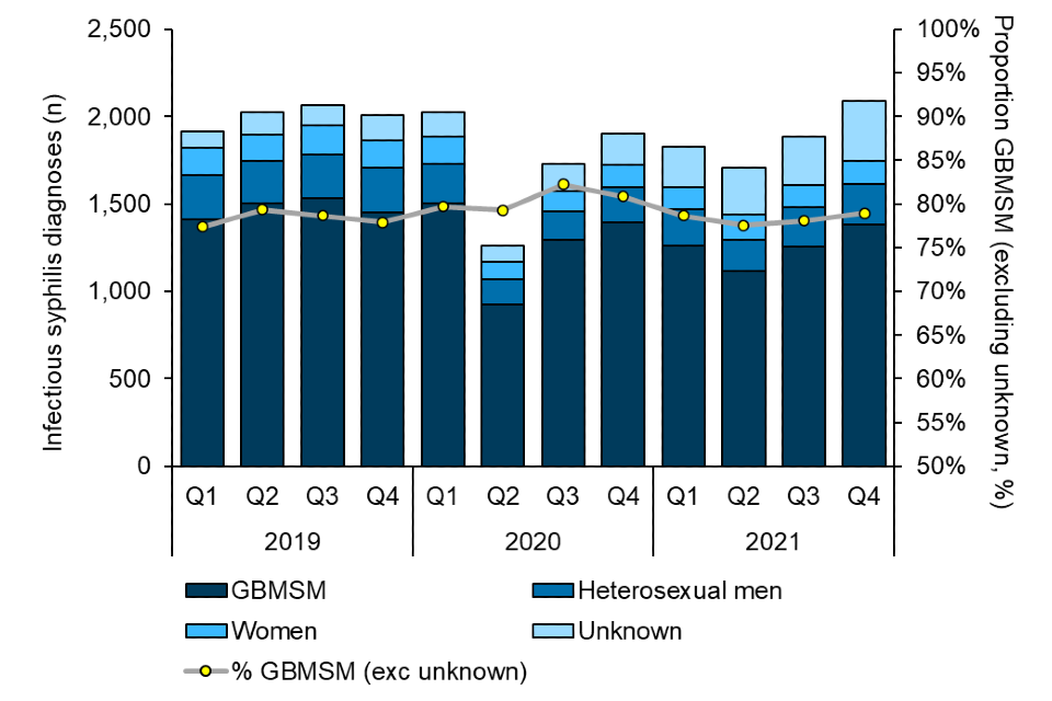- gay, bisexual and other men who have sex with men remain disproportionately affected by syphilis (71% of all infectious syphilis diagnoses in 2021)