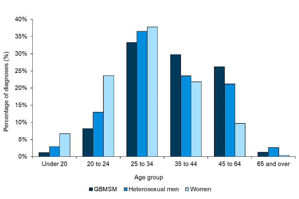 Most diagnoses in all groups occur in the 25 to 34 age group (33%, 37% and 38% in GBMSM, heterosexual men and women, respectively).