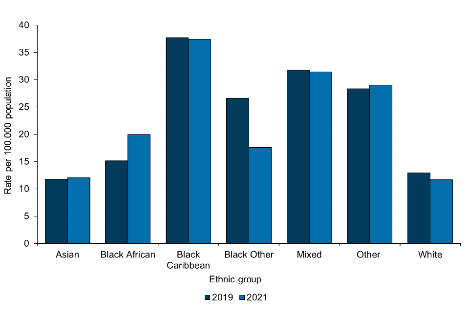 ONS population estimates by ethnic group were only available for 2011 at the time of publication. Therefore, population estimates for 2011 have been used as a proxy for 2019 and 2021.
