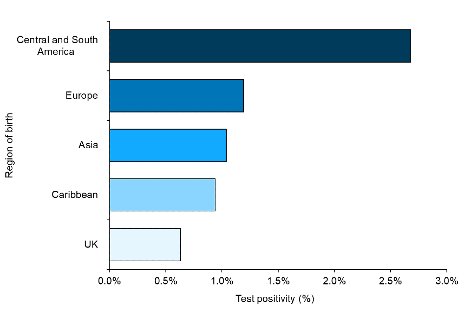 Figure 10. Syphilis test positivity by region of birth, 2021, England