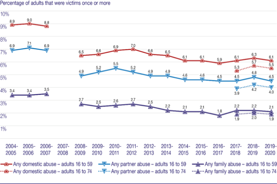 Problem One, the stubbornly high prevalence of domestic abuse. The 2019-20 CSEW estimated that 2.3 million adults aged 16 to 74 experienced domestic abuse in England and Wales [footnote 16] in the previous year. These numbers are intolerably high.