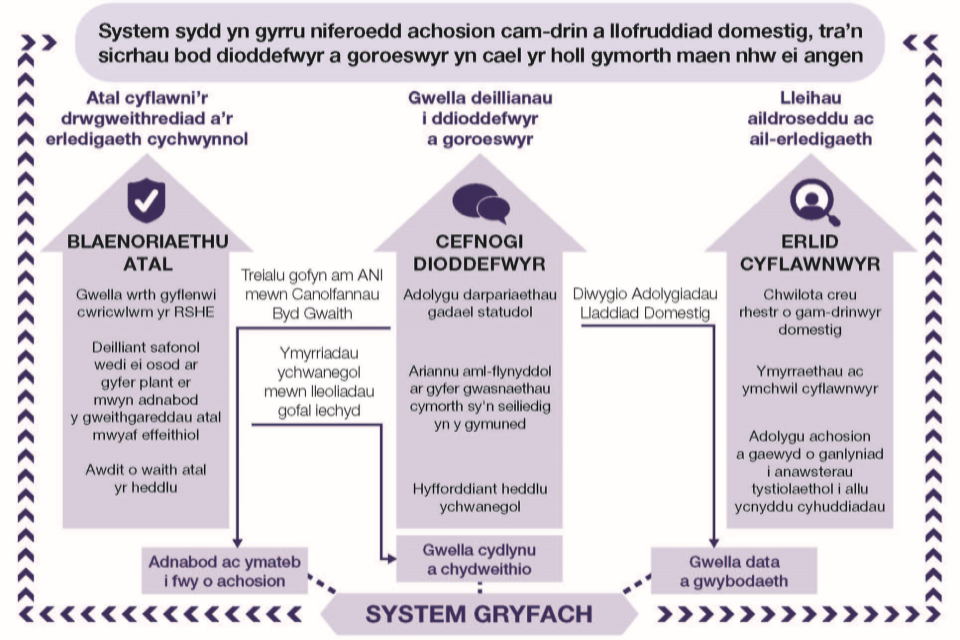 Mae elfennau’r cynllun hwn sydd yn ymwneud â throsedd, plismona a chyfiawnder yn berthnasol i Gymru a Lloegr. Mae’r elfennau sydd yn ymwneud ag iechyd, gofal cymdeithasol, ac addysg wedi eu datganoli i Gymru, yr Alban a Gogledd Iwerddon, ac felly maent yn berthnasol i Loegr yn unig. Mae Llywodraeth Cymru wedi bod yn ymgysylltu drwy gydol y broses o ddatblygu’r Cynllun.