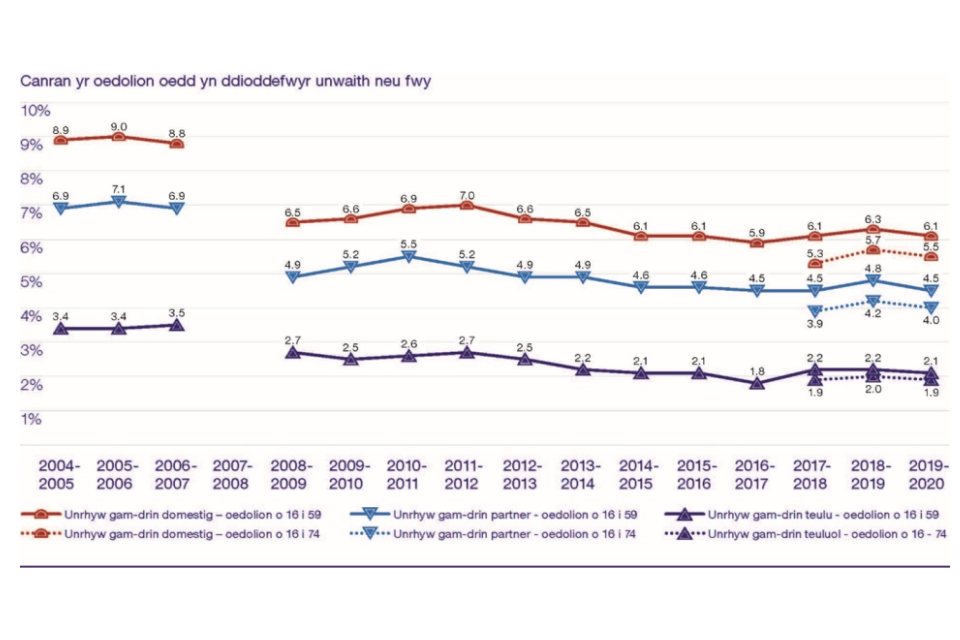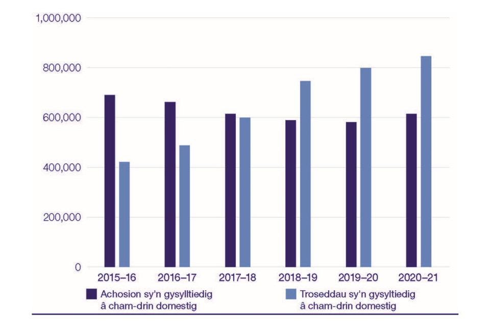 Problem un, y nifer cyndyn o uchel o gam-drin domestig. Amcangyfrifodd CSEW 2019-20 fod 2.3 miliwn o oedolion16 i 74 oed wedi profi cam-drin domestig yng Nghymru a Lloegr yn ystod y[footnote 16] flwyddyn flaenorol. Mae’r niferoedd hyn yn annerbyniol o uchel.