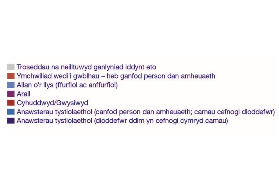 *Mae Arolwg Troseddau Cymru a Lloegr (CSEW) yn arolwg wyneb-yn-wyneb cynrychioliadol cenedlaethol o ddioddefwyr, lle holir pobl sy’n byw ar aelwydydd yng Nghymru a Lloegr am eu profiadau o amrywiaeth o droseddau yn y 12 mis cyn y cyfweliad. Mae hyn yn cynnwys modiwlau i’w cwblhau gan y bobl eu hunain am rai pynciau, sy’n cynnwys cam-drin domestig. O ran y mathau o droseddau a’r boblogaeth yr ymdrinnir ag ef, mae’r CSEW yn adlewyrchiad gwell o wir faint troseddau a ddaeth i ran y boblogaeth nag ystadegau a gofnodwyd gan yr heddlu, oherwydd bod yr arolwg yn cynnwys troseddau nas adroddwyd amdanynt wrth yr heddlu, ac na chofnodwyd ganddynt.
